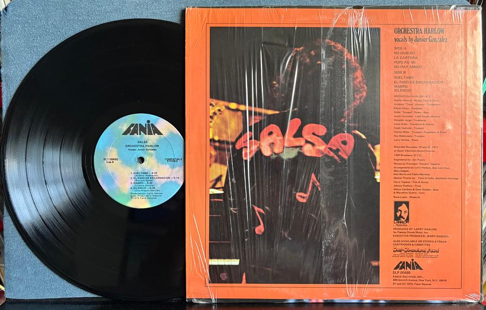Original 1974 Fania Records issue with cover still in the SHRINK-WRAP! Vinyl has several faint surface sleeve scuffs on side A and a couple faint paper sleeve scuffs on side B just holding grade back from NM-, nothing I can feel. Labels are excellent. Cover in original shrink-wrap has cornerwear/lightly dinged corners, a slight bend/crease top right corner and a hint of wear along exposed right side edge. Shrink split/ripped at the middle of the top edge.